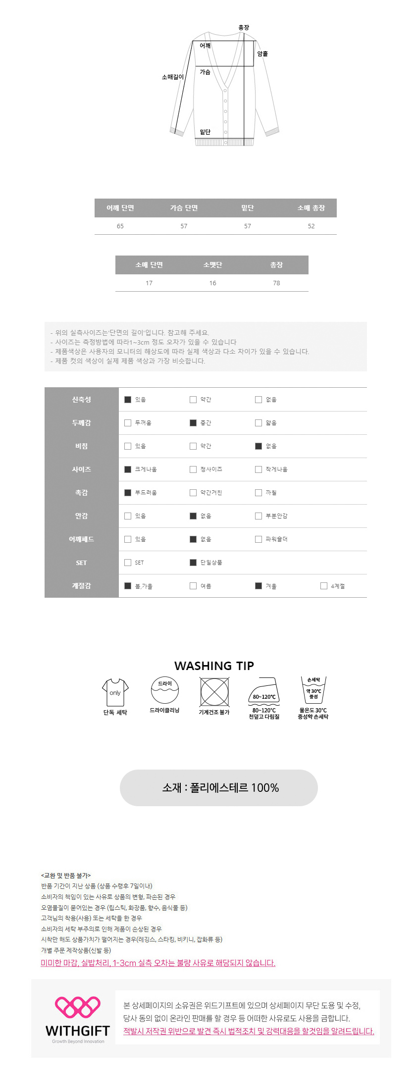 | 세탁방법 및 취급시 주의사항 | 상품 상세정보에 별도 표기 |