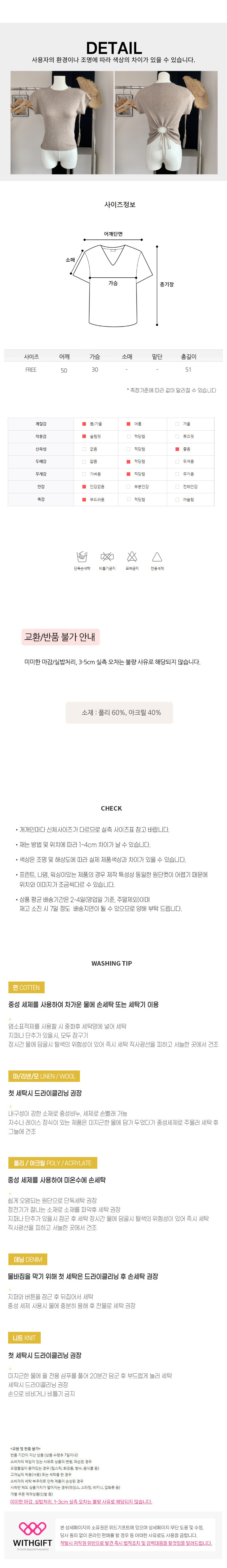 | 세탁방법 및 취급시 주의사항 | 상품 상세정보에 별도 표기 |